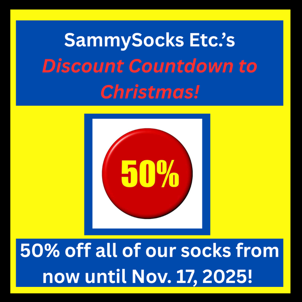 SammySocks Etc. is kicking off its Discount Countdown to Christmas! The next 2 months will showcase various discounts starting with 50% off of all of our socks from now until November 17, 2025!